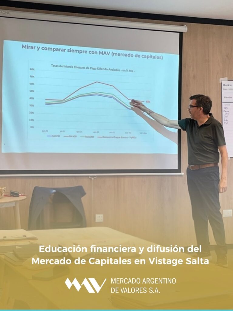 En su participación en las reuniones Vistage Salta, evento de networking y desarrollo para empresarios y líderes de la región NOA enfocadas en el crecimiento personal y de negocios a través de grupos de pares, coaching y talleres de expertos, Fabio Rodríguez, Consultor Económico de MAV, compartió las oportunidades que brinda el Mercado de Capitales y la gestión del Mercado Argentino de Valores en la jerarquización de la oferta y la demanda de crédito.