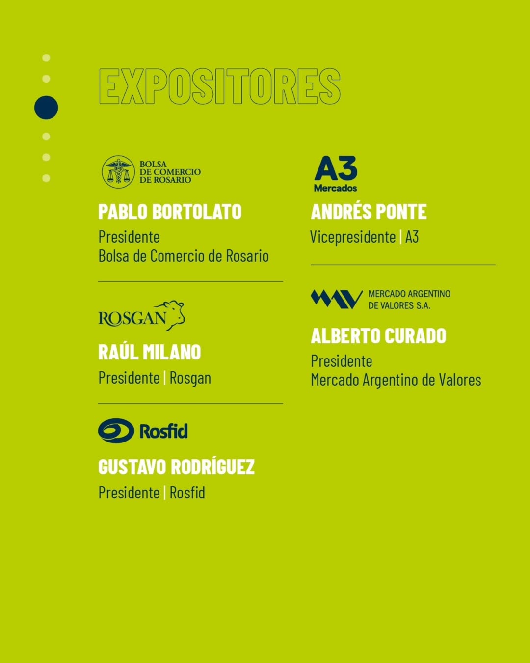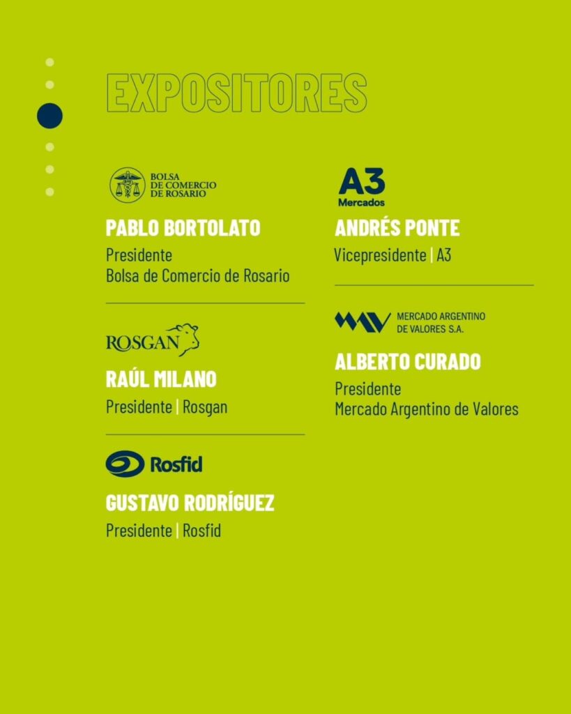 Nuestro presidente compartirá el panel con destacados referentes del ecosistema de Mercados: Pablo Bortolato, Presidente de la Bolsa de Comercio de Rosario, Raúl Milano, Presidente de Rosgan, Gustavo Rodríguez, Presidente de Rosfid, y Andrés E. Ponte, Vicepresidente de A3 Mercados.
